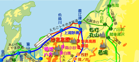 いつもの駅から列車で気楽に行く。ゲレンデまではここまで便利に!自宅や職場の最寄り駅から出発できる。大阪から特急列車で出発すれば、3時間あまりで西日本最大級のスキー場のゲレンデに立てる!降車駅や乗換駅で食事や買い物、散策も楽しめるし、街に宿泊したら地元の店で食事を楽しんで満喫しよう。福井までは敦賀で乗り換えが必要だけど、時間に余裕があれば、敦賀駅でアルプラザへ行って酒や食べ物を買って1本後の列車で行くのもあり。 |